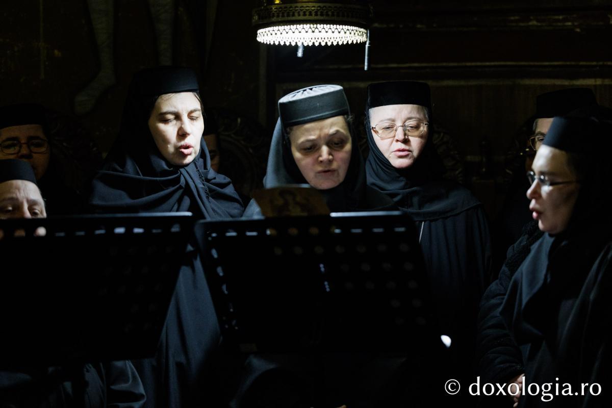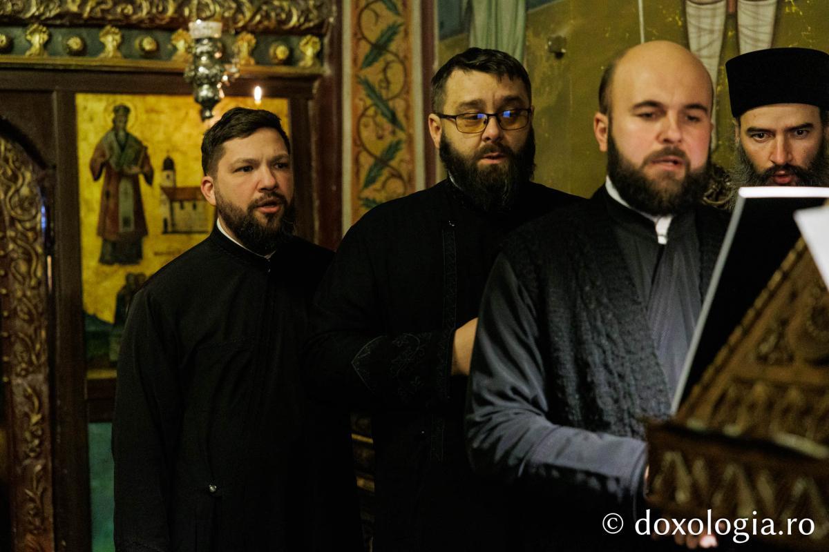 La slujba privegherii a slujit un sobor de preoți și diaconi sub protia părintelui arhimandrit Elisei Nedescu, starețul Mănăstirii „Sfinții Trei Ierarhi” din Iași, iar răspunsurile liturgice au fost date de Corul preoțesc „Apostolii” (în strana dreaptă) și, respectiv, de corul mănăstirii Copou (în strana stângă).